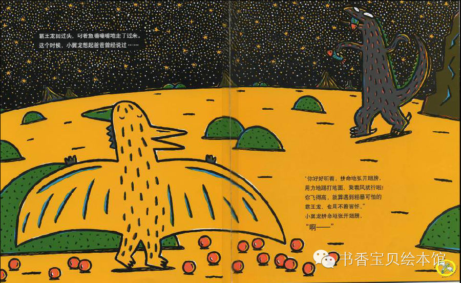 “你好好听着,拼命地张开翅膀,用力踢打地面,乘着风就行啦!你飞得高,就算遇到粗暴的霸王龙,也不用着害怕。”