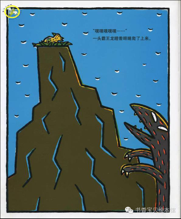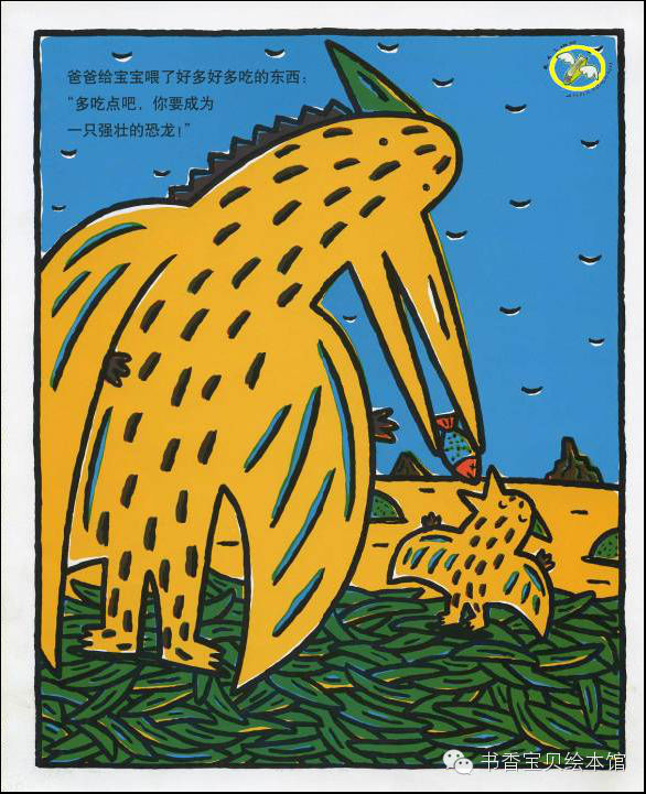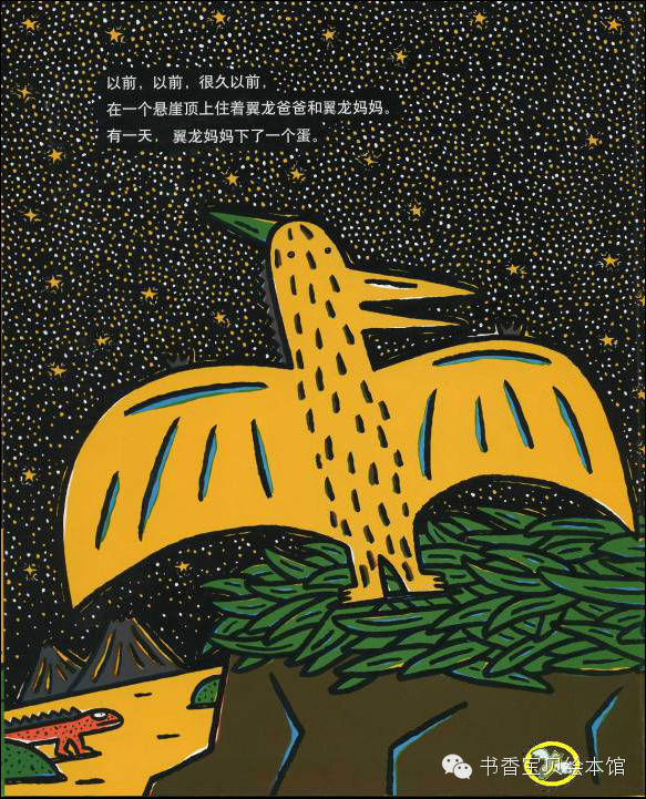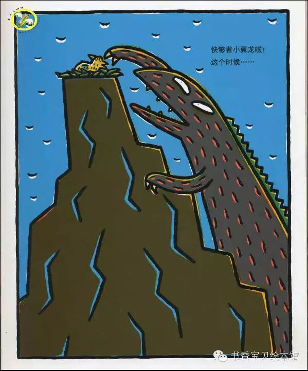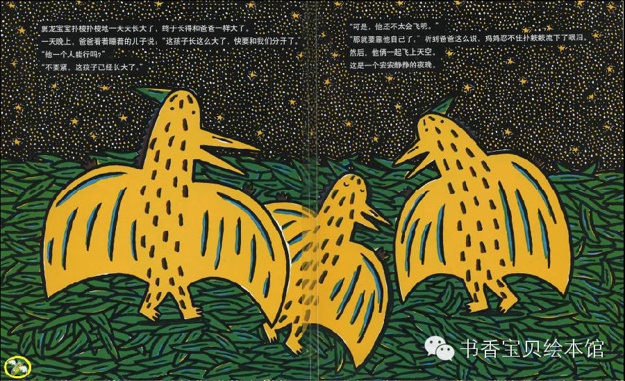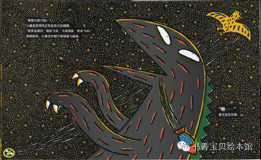 爸爸教他怎么飞行:“你好好听着,拼命地张开翅膀,用力踢打地面,乘着风就行啦!只要你飞得高,就算遇到粗暴的可怕的霸王龙,也用不着害怕。”