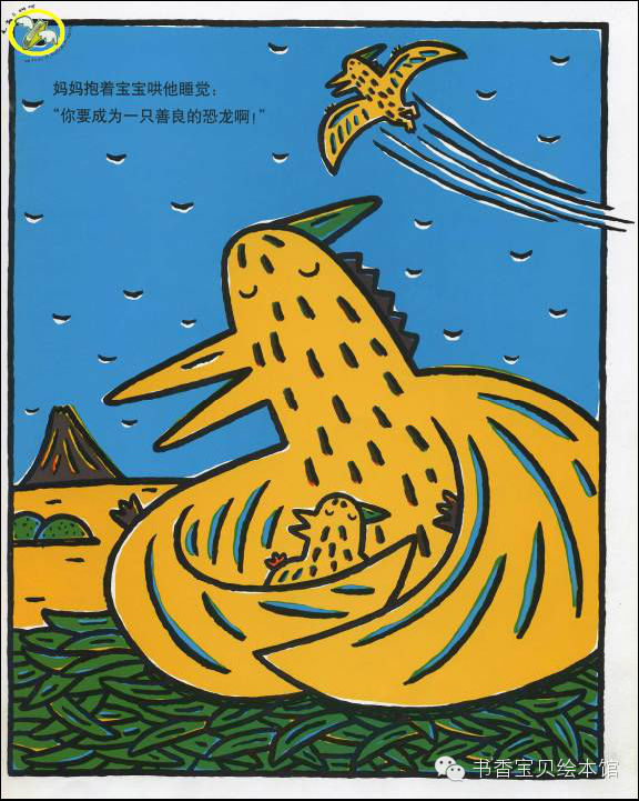 妈妈抱着宝宝哄他睡觉:“你要成为一只善良的恐龙啊!”