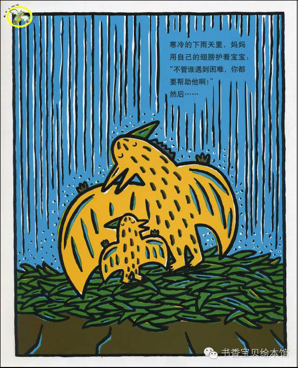 寒冷的下雨天里,妈妈用自己的翅膀护着宝宝:“不管谁遇到困难,你都要帮助他啊!”