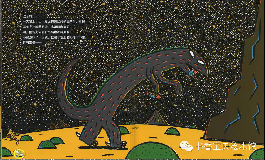 一天晚上,当小翼龙抱着红果子回来时,看见霸王龙正瞪着眼睛,嘴里叨着鱼呢。
