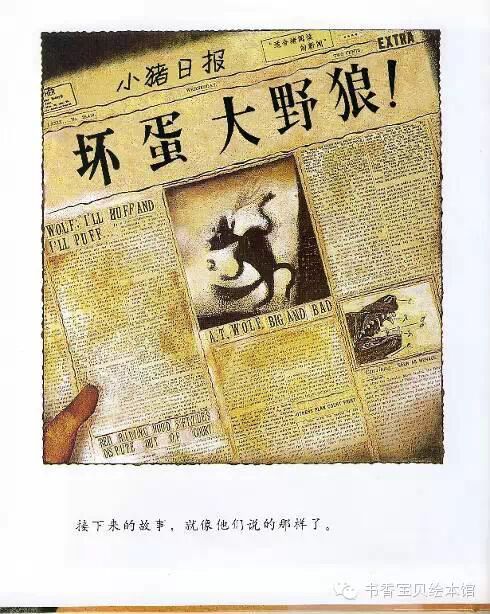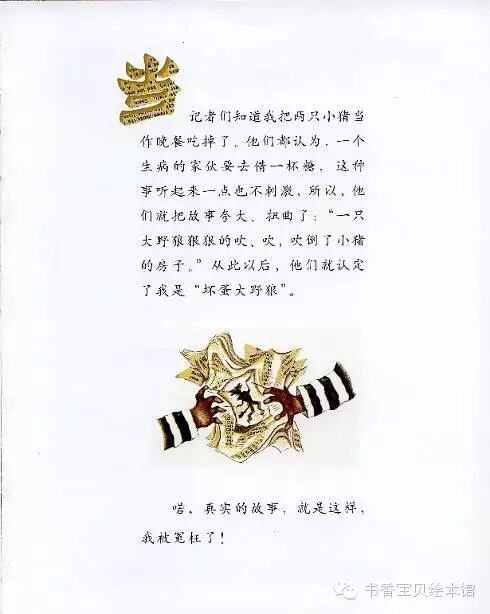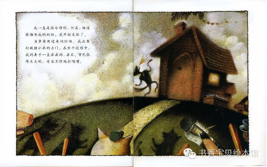 记者们知道我把两只小猪当作晚餐吃掉了。他们都认为,一个生病的家伙要去借一杯糖,这种事听起来一点了不刺激,所以,他们就把故事夸大了、扭曲了:“一只大野狼狠狠地吹、吹、吹倒了小猪的房子。”从此以后,他们就认定了我是“坏蛋大野狼”。