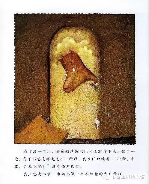 我才敲一下门,那扇稻草做的门马上就掉下来,散了一地。我可不想这样走进去,所以,我在门口喊着:“小猪,小猪,你在家吗?”没有任何回答。
