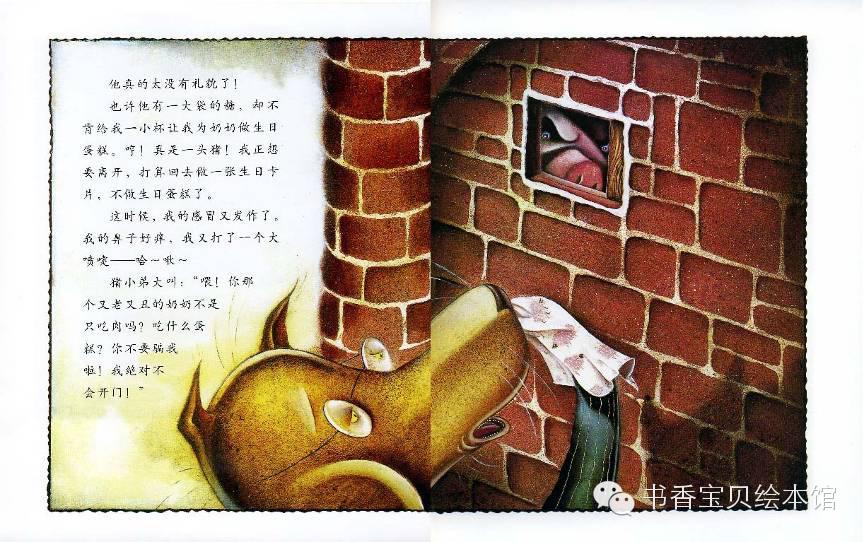猪小弟大叫“喂!你那个又老又丑的奶奶不是只吃肉吗?吃什么蛋糕?你不要骗我啦!我绝对不会开门!”