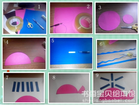 1材料:蓝色卡纸、粉色卡纸、白色卡纸、黑色卡纸、剪刀、固体胶、笔、宽胶带