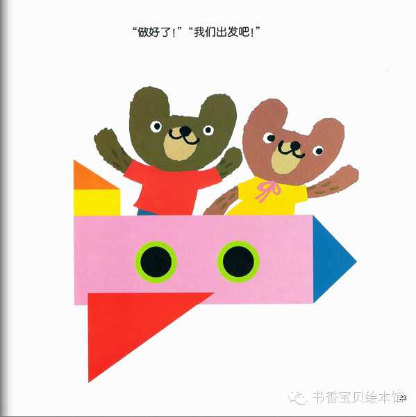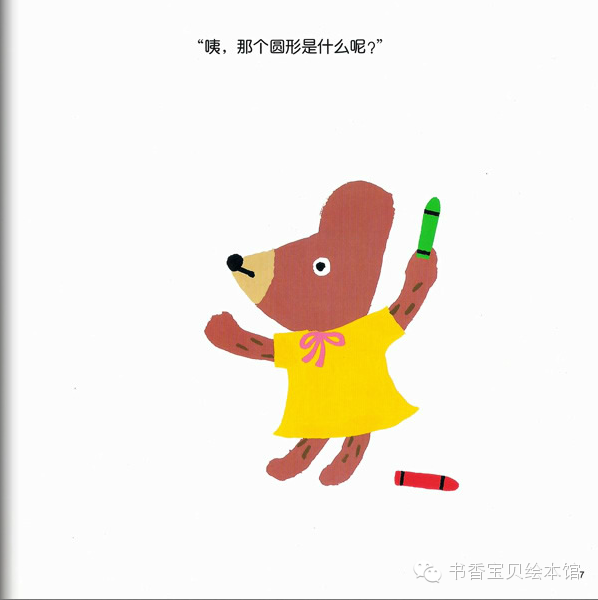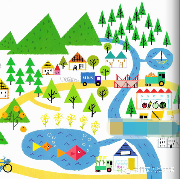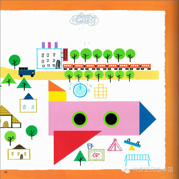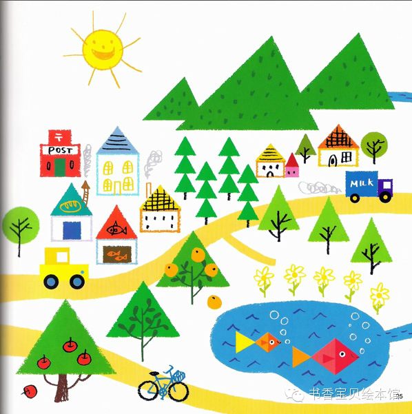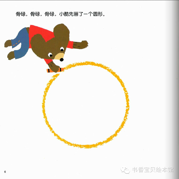 咕噜、咕噜。熊宝宝小酷先画了一个圆形。小玛刷刷地画了一个三角形。接着,它们画出了各种不同形状的图形,终于画出了小镇……