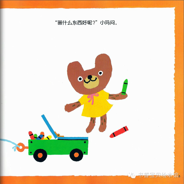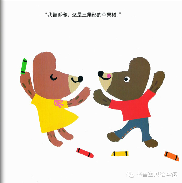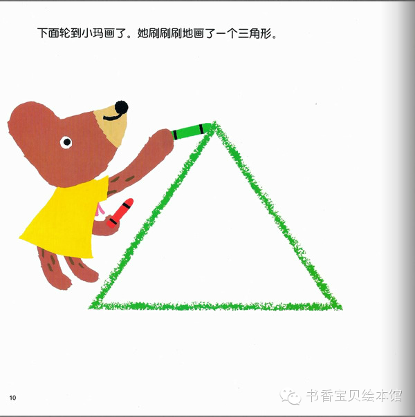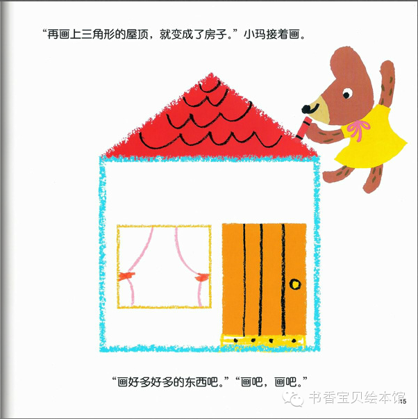 故事导读:熊宝宝小酷和小玛在好大的一张纸上画画。圆形、三角形、方形……圆形做太阳、三角形做苹果树、那方形加三角形会画成什么呢?小酷和小玛画出了各种不同形状的图形,终于画出了小镇……