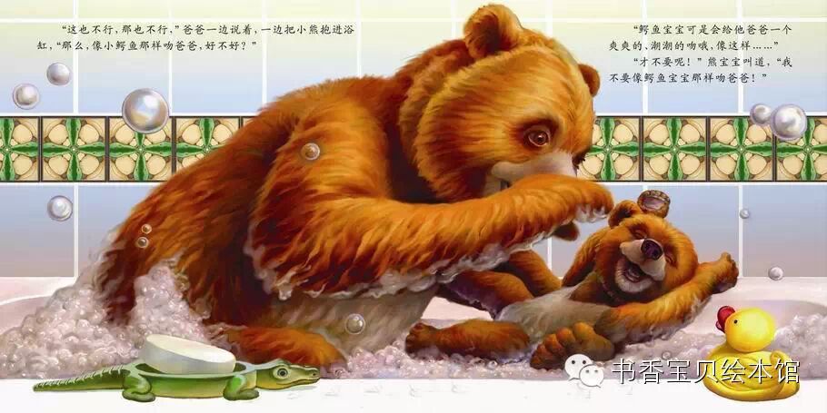 “才不要呢!”熊宝宝叫道,“我不要像鳄鱼宝宝那样吻爸爸!”