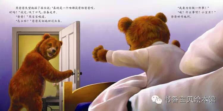 “爸爸好伤心哦!”爸爸撇撇嘴说,给熊宝宝盖上小毛毯,遮住他的小下巴,“那么,像小老鼠那样吻一下爸爸,好不好?”
