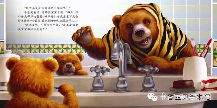 “你可真是个不听话的小家伙呢!”爸爸笑着说,递给熊宝宝牙刷,“那么,像小老虎那样吻爸爸,好不好?老虎宝宝可是会给他爸爸一个最炫、最热烈的吻哦,就象这样------”