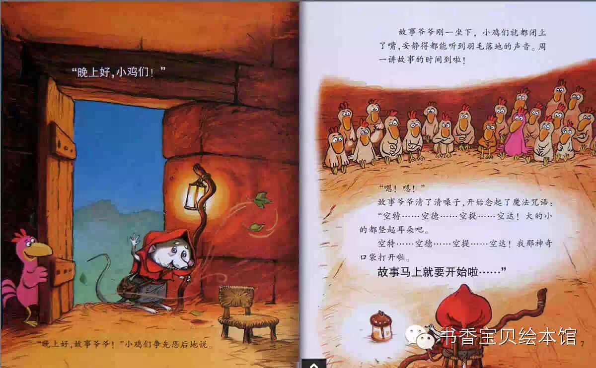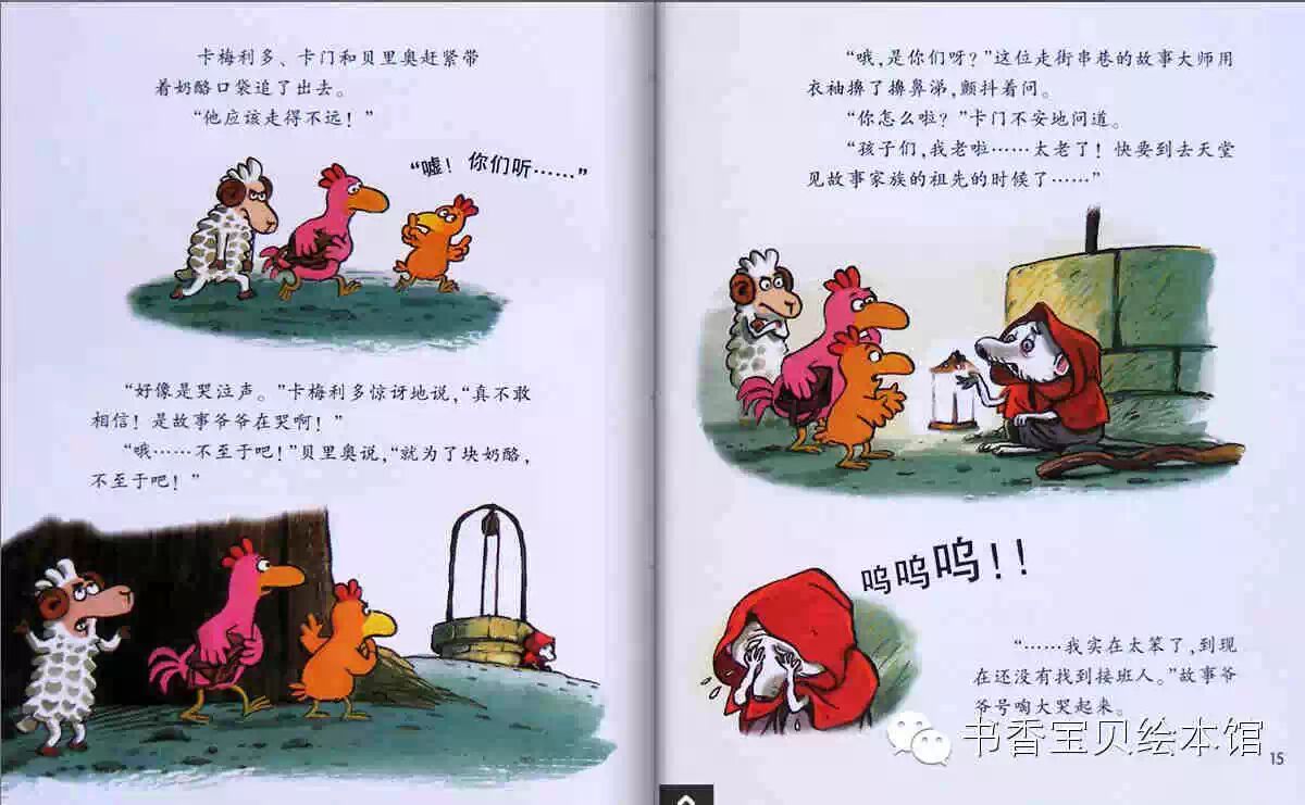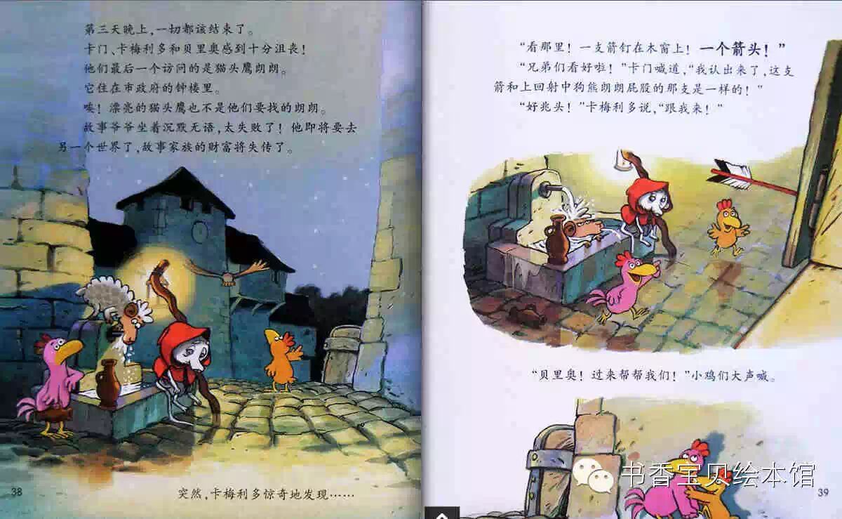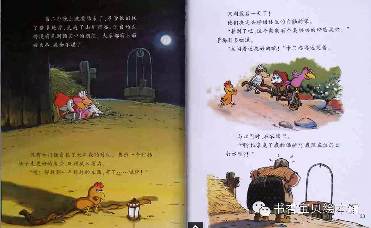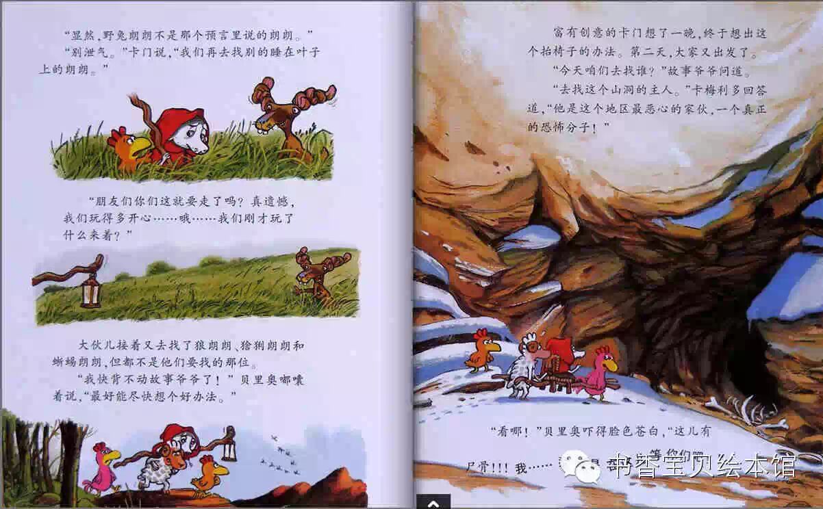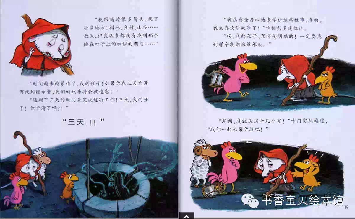 内容简介: 儿童故事绘本中小鸡们特别喜欢、特别期待星期一。每到星期一,大家就整整齐 齐端坐在一起,紧紧盯着鸡舍大门。当敲门声响起,美好的时刻就开始了,大家 热烈欢迎故事爷爷的到来。故事爷爷准备讲故事了,喧闹的小鸡们立刻安静下来 ,静的连羽毛掉在地上都能听见。故事爷爷绘声绘色的讲完一个又一个故事,小 鸡们听的全神贯注,完全沉浸在童话故事当中,时间过得很快,童话故事讲完了 ,在小鸡们的不舍中,爷爷出发到另一个地方去讲故事了。他走啊走啊,步履显 得那么沉重,他哧呼哧呼的喘着气,关节咔咔作响,故事爷爷在一口古井边停了 下来,他悲哀的想到,我变老啦,走不动了,再也不能像以前那样奔波于鸡舍间 了,那么以后谁来给孩子们讲童话故事呢?鸡舍里,卡梅利多、卡门和贝里奥发 现故事爷爷遗落了他的奶酪口袋,于是一路追赶,去发现故事爷爷在古井边哭泣 ,原来,故事爷爷很遗憾没有找到接班人,而他自己已经年迈的快离开这个世界 了。正在这时,故事大王的鬼魂出现了,他提示故事爷爷能找到继承者的预言, 这个睡在叶子上的继承者叫朗朗,只要跟着箭头就能找到他。而三天内如果还找 不到朗朗,故事家族的财富将永远失传,以后再也没有人知道这么多童话故事, 在也没有人讲故事给孩子们听了。故事爷爷很沮丧,卡梅利多、卡门和贝里奥决 定帮助故事爷爷找到继承者朗朗,时间紧迫,他们马上就开始行动了,一路寻找 ,他们经历了怎样的艰难险阻,遇见了多么稀奇古怪的动物,碰到了怎样的危险 ,就让小读者们亲自去了解吧。 编辑推荐: 卡梅利多和朋友们正直勇敢,还有助人为乐的热心肠,他们不怕艰难险阻,跋山 涉水,翻山越岭,故事爷爷年迈走不动,他们还背、抬、甚至弄了副轱辘车,想 尽各种办法带着故事爷爷一起走,只为了帮助故事爷爷寻找继承人。历尽千辛万 苦,他们最终帮助故事爷爷实现了愿望。假如孩子太小,可能复杂的画面和情节 不会吸引他,但是等孩子长大一点,就会有耐心去读故事,这时候,恐怕会突然 一下子就爱上这套情节紧凑有趣,想象力丰富超有意思的书。