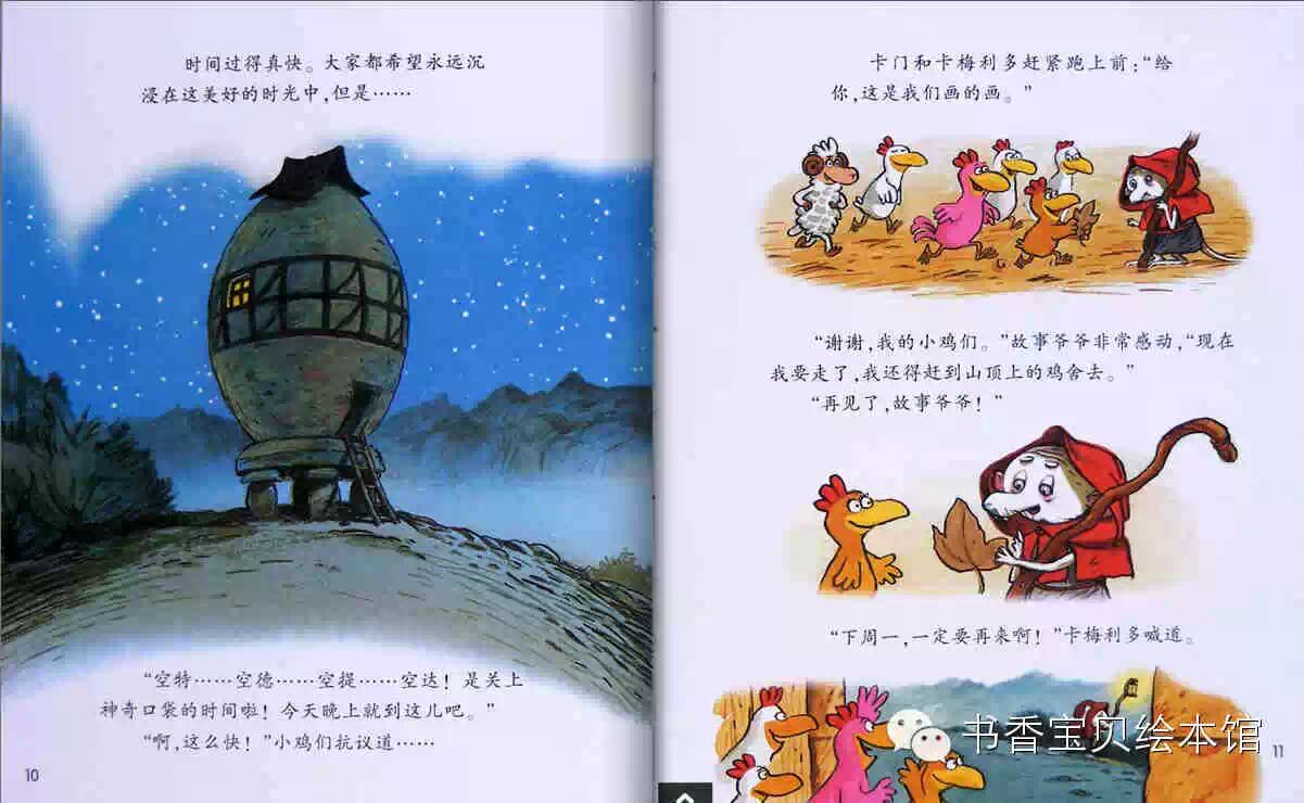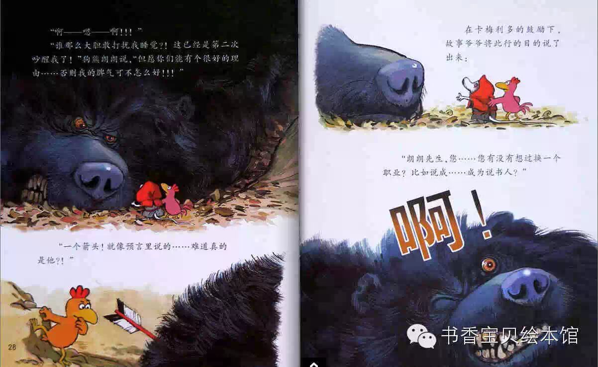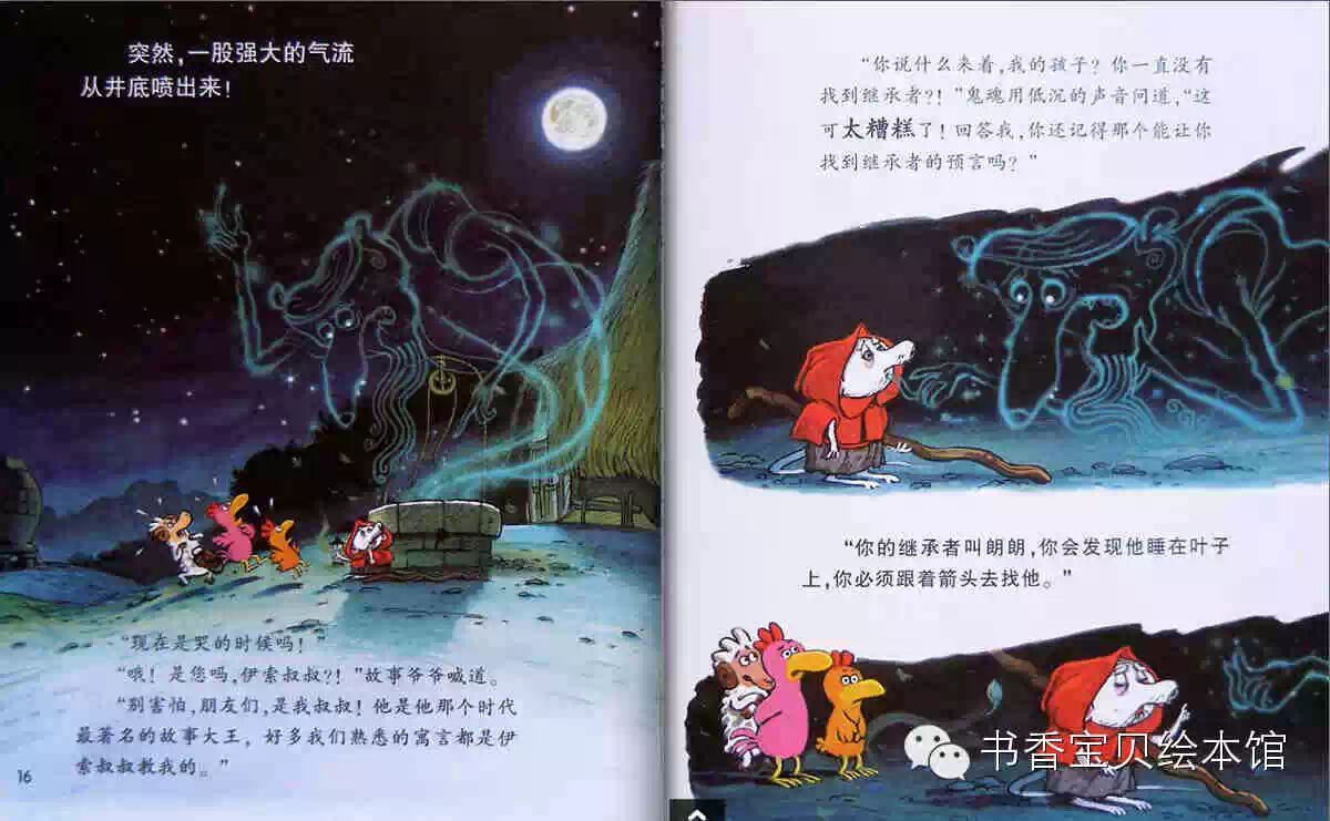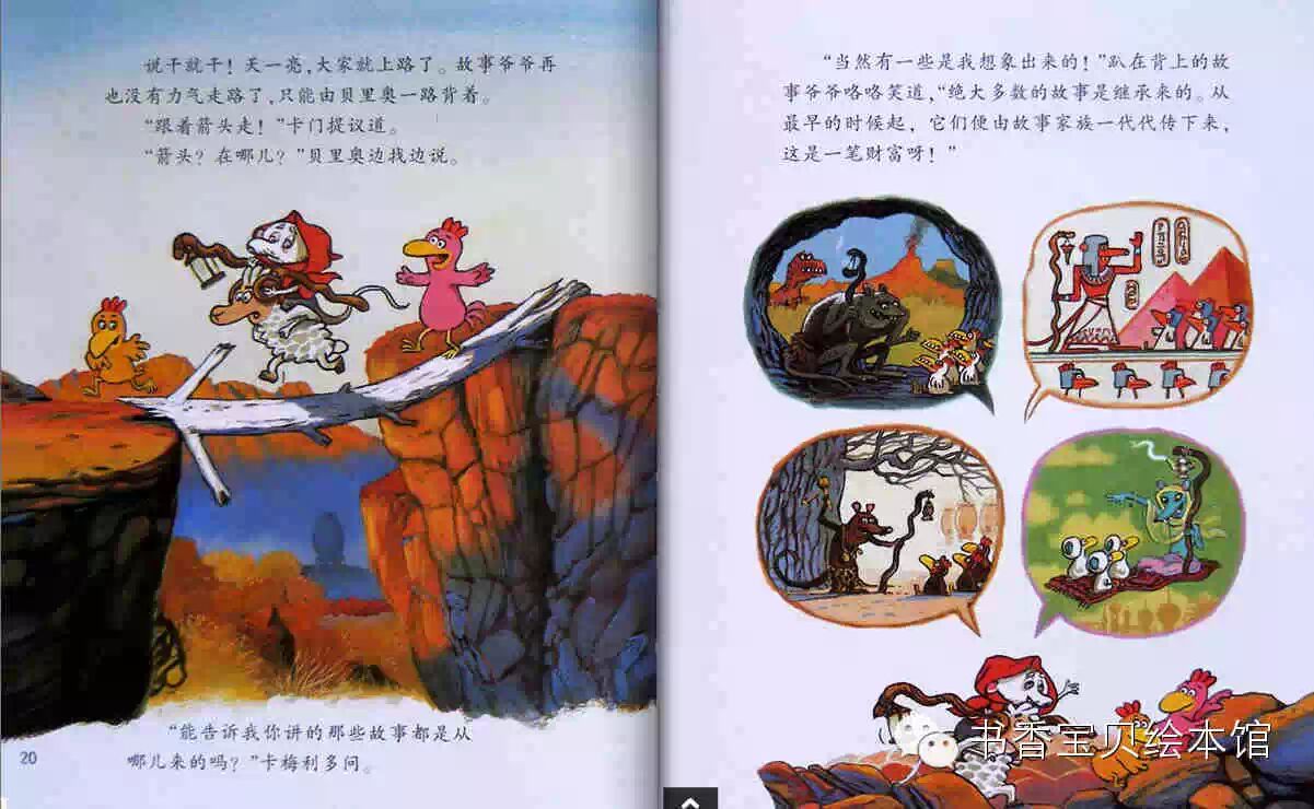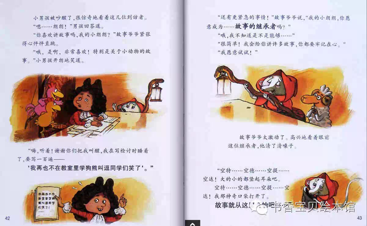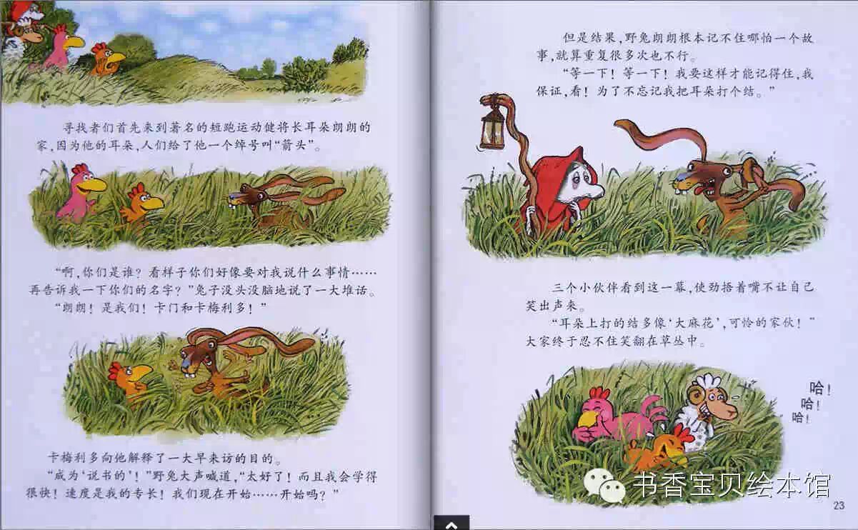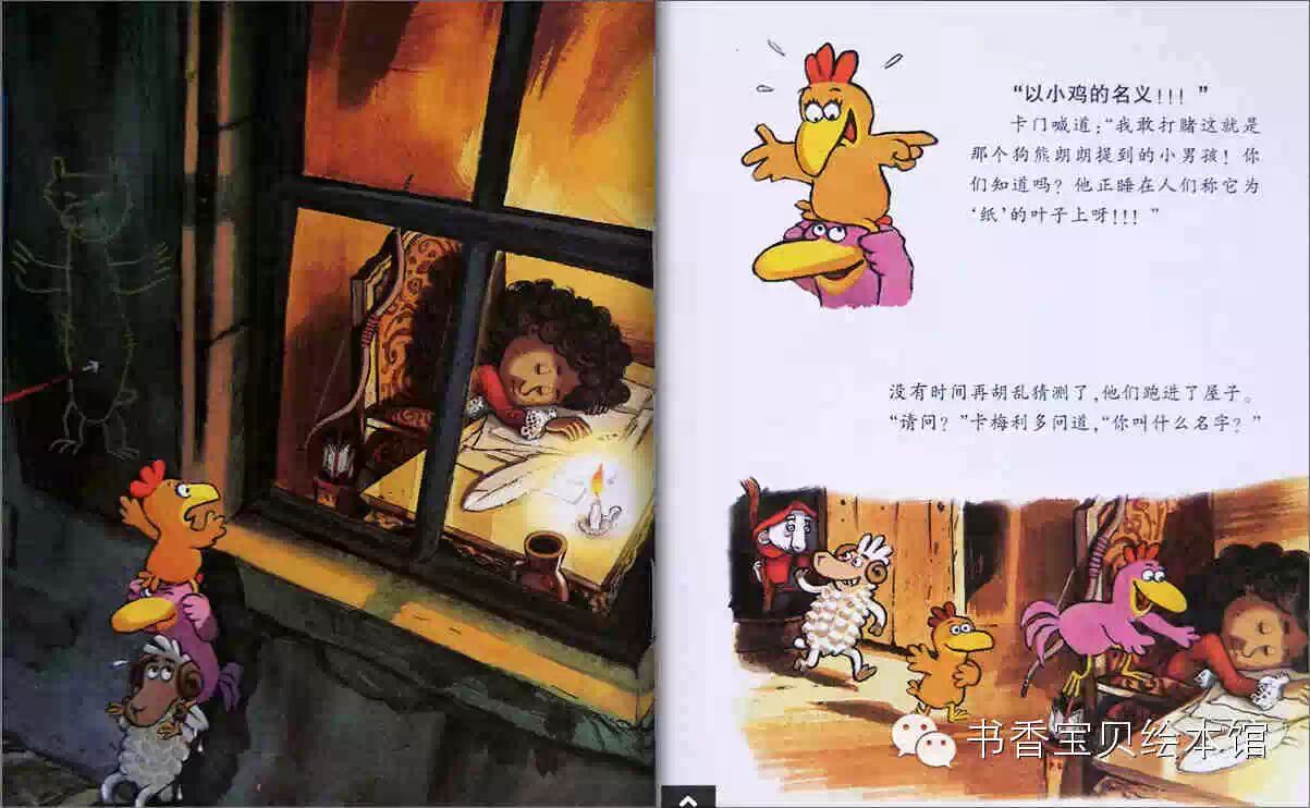 内容简介: 儿童故事绘本中小鸡们特别喜欢、特别期待星期一。每到星期一,大家就整整齐 齐端坐在一起,紧紧盯着鸡舍大门。当敲门声响起,美好的时刻就开始了,大家 热烈欢迎故事爷爷的到来。故事爷爷准备讲故事了,喧闹的小鸡们立刻安静下来 ,静的连羽毛掉在地上都能听见。故事爷爷绘声绘色的讲完一个又一个故事,小 鸡们听的全神贯注,完全沉浸在童话故事当中,时间过得很快,童话故事讲完了 ,在小鸡们的不舍中,爷爷出发到另一个地方去讲故事了。他走啊走啊,步履显 得那么沉重,他哧呼哧呼的喘着气,关节咔咔作响,故事爷爷在一口古井边停了 下来,他悲哀的想到,我变老啦,走不动了,再也不能像以前那样奔波于鸡舍间 了,那么以后谁来给孩子们讲童话故事呢?鸡舍里,卡梅利多、卡门和贝里奥发 现故事爷爷遗落了他的奶酪口袋,于是一路追赶,去发现故事爷爷在古井边哭泣 ,原来,故事爷爷很遗憾没有找到接班人,而他自己已经年迈的快离开这个世界 了。正在这时,故事大王的鬼魂出现了,他提示故事爷爷能找到继承者的预言, 这个睡在叶子上的继承者叫朗朗,只要跟着箭头就能找到他。而三天内如果还找 不到朗朗,故事家族的财富将永远失传,以后再也没有人知道这么多童话故事, 在也没有人讲故事给孩子们听了。故事爷爷很沮丧,卡梅利多、卡门和贝里奥决 定帮助故事爷爷找到继承者朗朗,时间紧迫,他们马上就开始行动了,一路寻找 ,他们经历了怎样的艰难险阻,遇见了多么稀奇古怪的动物,碰到了怎样的危险 ,就让小读者们亲自去了解吧。 编辑推荐: 卡梅利多和朋友们正直勇敢,还有助人为乐的热心肠,他们不怕艰难险阻,跋山 涉水,翻山越岭,故事爷爷年迈走不动,他们还背、抬、甚至弄了副轱辘车,想 尽各种办法带着故事爷爷一起走,只为了帮助故事爷爷寻找继承人。历尽千辛万 苦,他们最终帮助故事爷爷实现了愿望。假如孩子太小,可能复杂的画面和情节 不会吸引他,但是等孩子长大一点,就会有耐心去读故事,这时候,恐怕会突然 一下子就爱上这套情节紧凑有趣,想象力丰富超有意思的书。