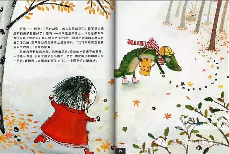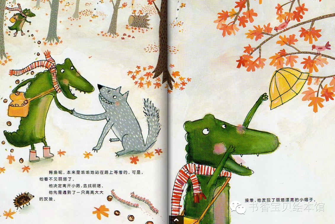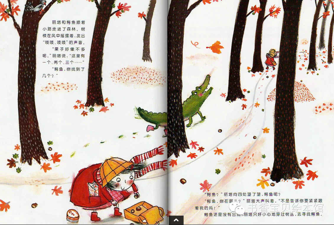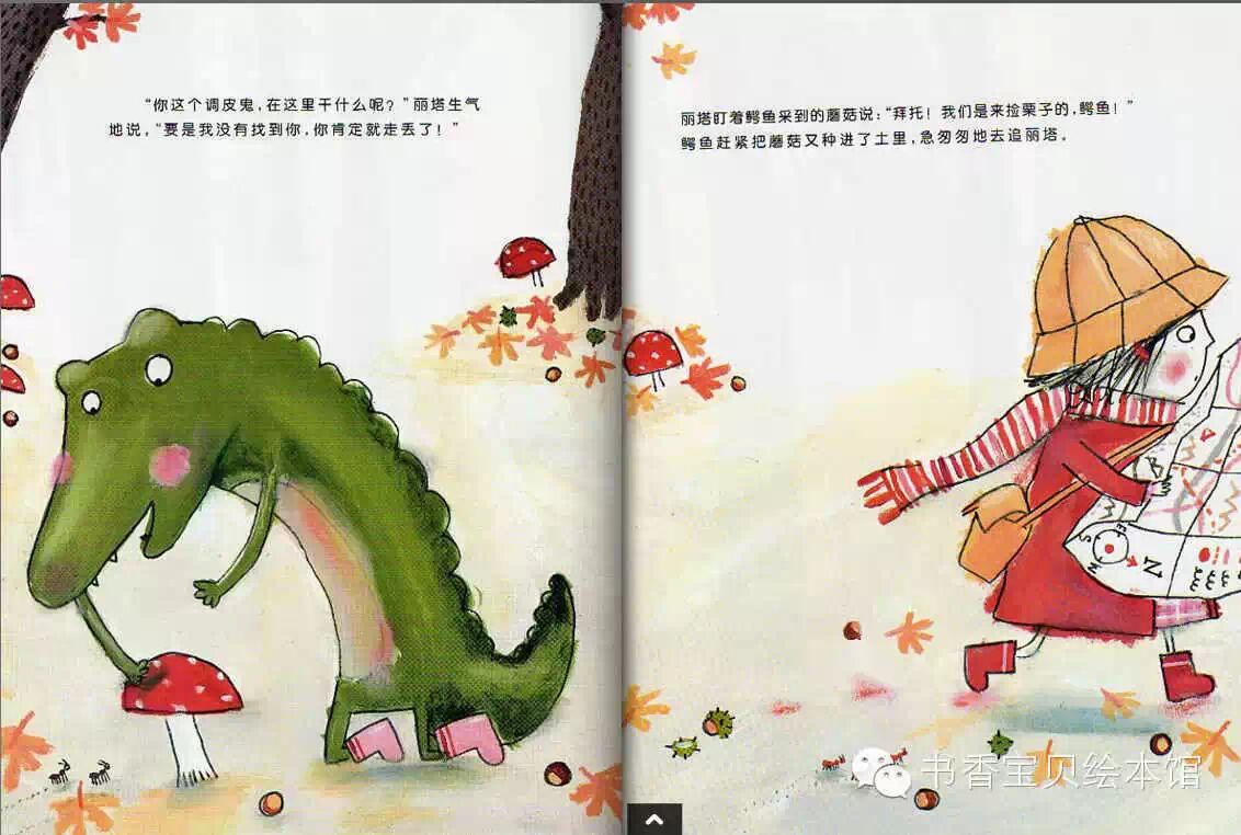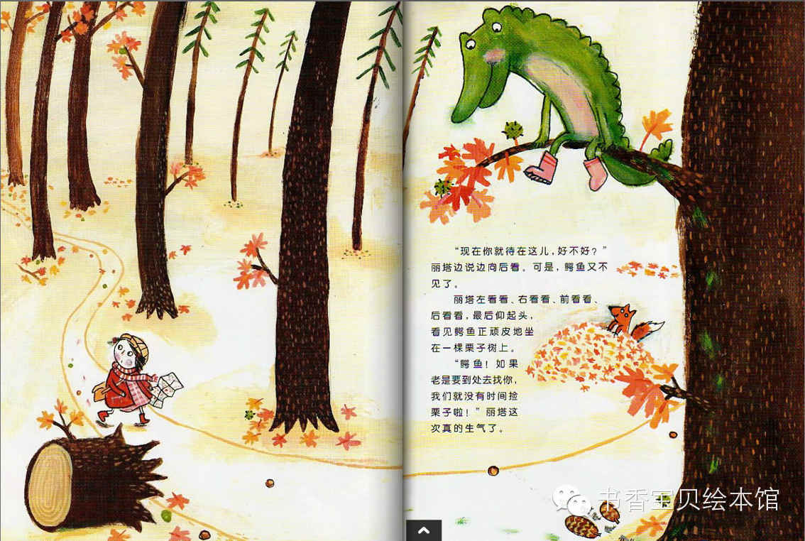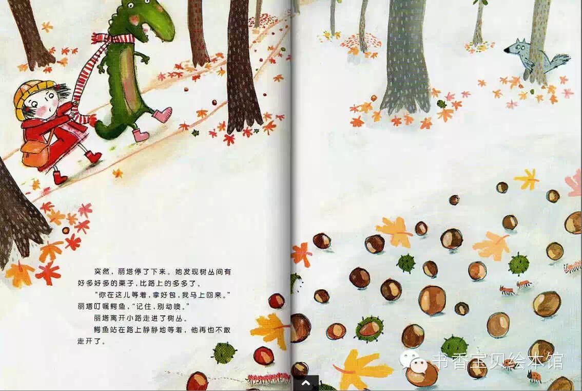 讲了一个很简单的故事,小女孩丽塔和宠物鳄鱼去森林捡栗子,她一再叮嘱鳄鱼,要紧紧跟着她,不然迷了路就找不到了。而且她还吓唬鳄鱼说“狼最喜欢吃鳄鱼了”。但事实是,鳄鱼没有迷路,而只顾着捡栗子的小女孩自己却迷路了,找不回鳄鱼等她的地方了。聪明的鳄鱼靠自己的智慧找到了小女孩,并满心期待小女孩会给她一个大大的拥抱,但是,女孩不仅没有鼓励他,还为自己辩解说:“你来这里干什么?不是让你乖乖地待在路上别动吗?现在你迷路了吧?”鳄鱼只是默默微笑着,并沿着刚才他特意洒下的栗子帮助女孩回到了来时的小路。