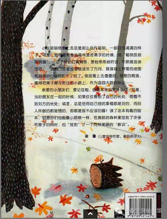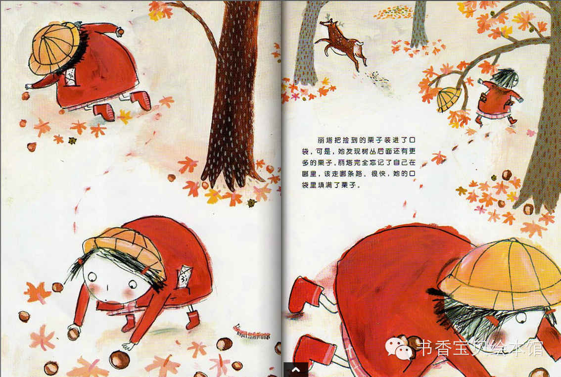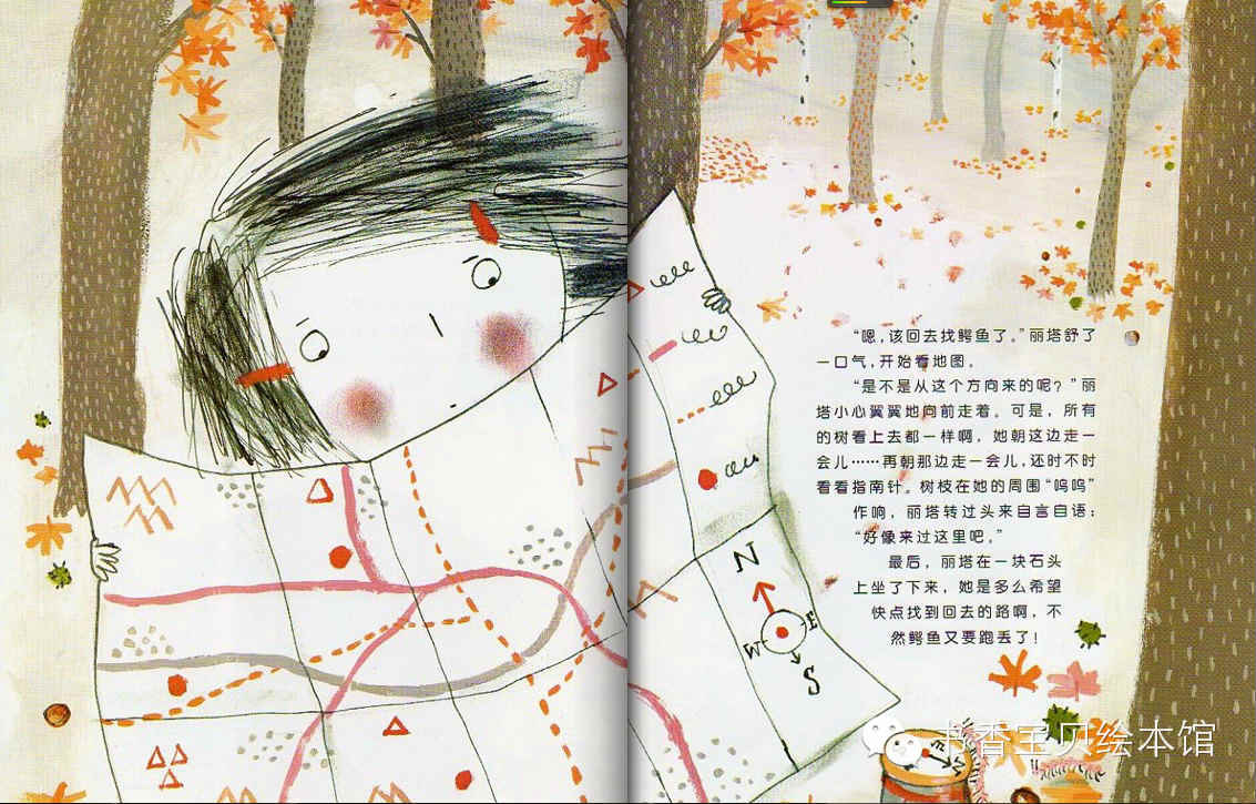 小女孩丽塔总是那么自作聪明,看上去一幅自信满满的样子。可是,她带着鳄鱼去森林里捡栗子的时候,却“聪明反被聪明误”,一边在不断地叮嘱鳄鱼,要他乖乖听话,不然就会迷路的,一边自己捡着、捡着就迷失了方向,就算身上带着的地图着指南针也帮不了她。倒是看上去傻傻的、憨憨的鳄鱼,懂得把栗子撒在走过的小路上,作为返回大路的标记……