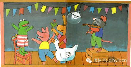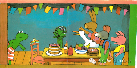 还有他的朋友们——鸭子、猪、老鼠和野兔。他们齐声唱着:“祝你生日快乐、祝你生日快乐......”
