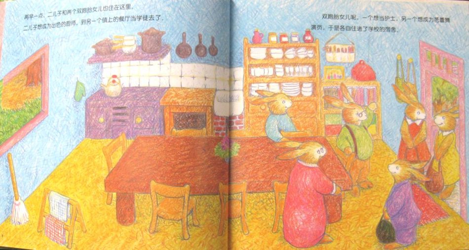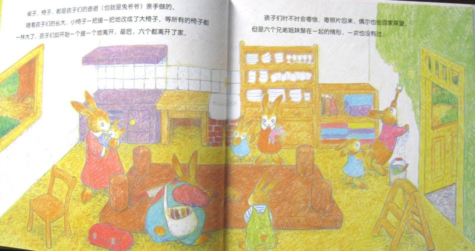 随着孩子们的长大,小椅子一把接一把地改成了大椅子。等所有的椅子都一样大了,孩子们却开始一个接一个地离开,最后,六个都离开了家。