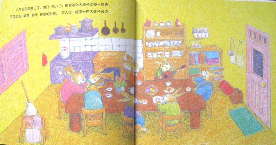 吃完晚饭,兔奶奶伏在空荡荡的桌子上,想念着她的孩子们。