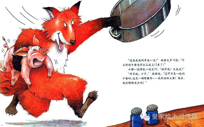 “对不起,小子,”狐狸说:“这可不是一般的午餐呐,这是一顿烤猪肉---我的美味大餐!现在,就到烤锅里去吧!”