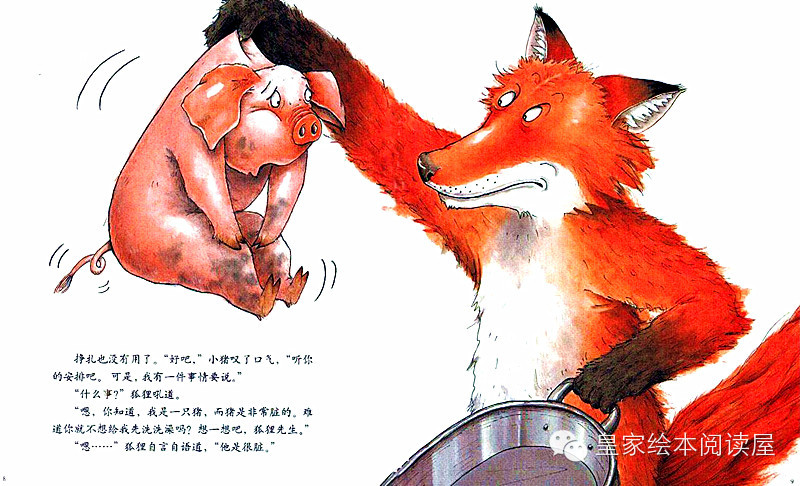“嗯,你知道,我是一只猪,而猪是非常脏的。难道你就不想给我先洗洗澡吗?想一想吧,狐狸先生。”
