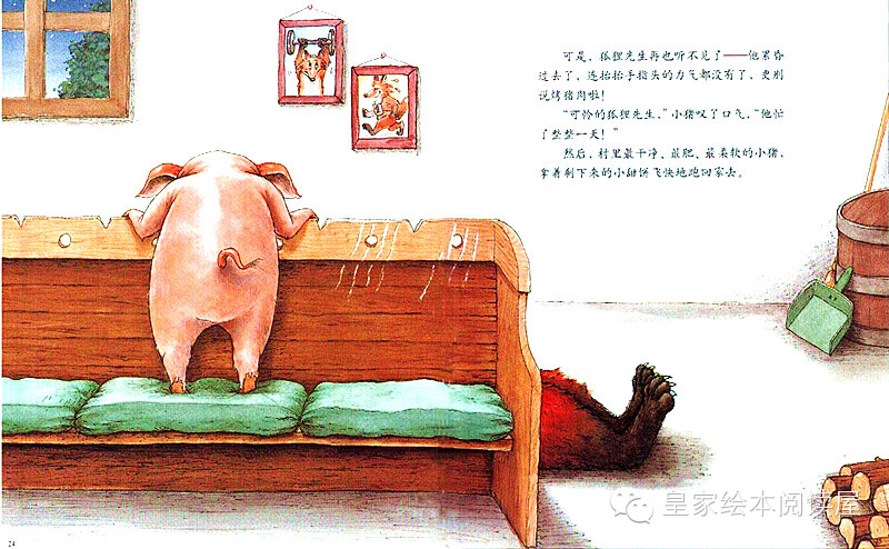 可是,狐狸先生再也听不见了....他累昏过去了,连抬抬手指头的力气都没有了,更别说烤猪肉啦!“可怜的狐狸先生,”小猪叹了口气,“他忙了整整一天!”