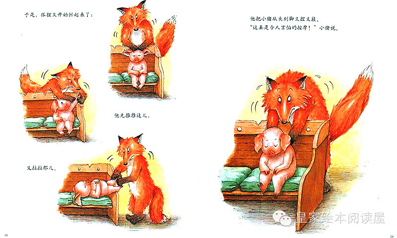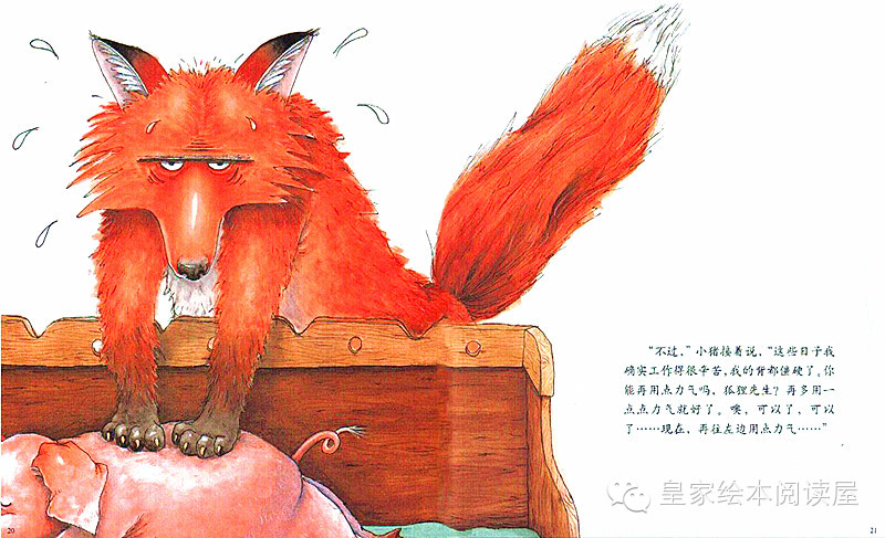 不过,”小猪接着说,“这些日子我确实工作得很辛苦,我的背都僵硬了。你能再用点力吗,狐狸先生?再多用一点点力气就好了。噢,可以了,可以了....现在,再往左边用点力气.....”