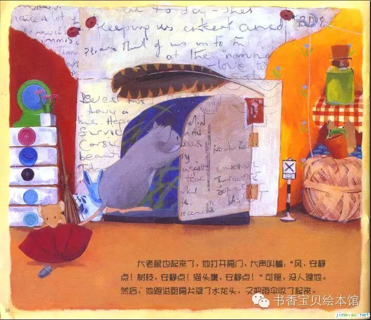 大老鼠也起来了,他打开房门,大声叫着:“风,安静点!树枝,安静点!猫头鹰,安静点!”可是,没人理他。然后,他跑进厨房关紧了水龙头,又把雨伞收了起来。
