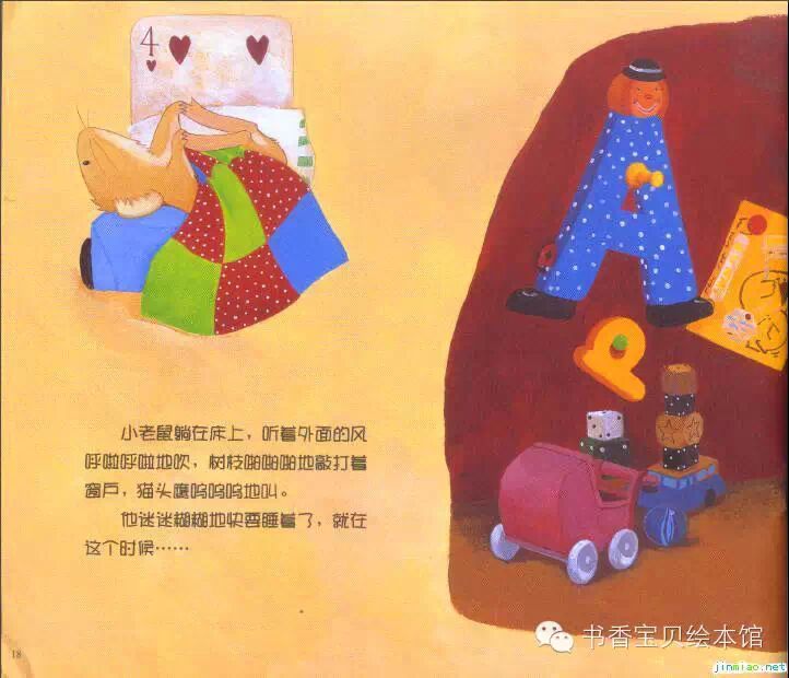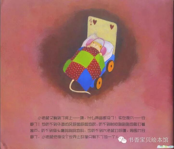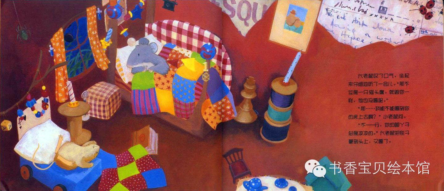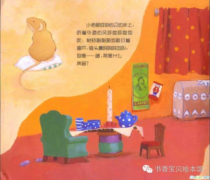 小老鼠又躺到了床上——咦,什么声音都没了!实在是太——安静了!他听不到外面的风呼啦呼啦地吹,听不到树枝啪啪啪地敲打着窗户,听不到猫头鹰呜呜呜地叫,也听不到大老鼠打呼噜。周围太安静了,小老鼠觉得这个世界上好像只剩下了他一个人。