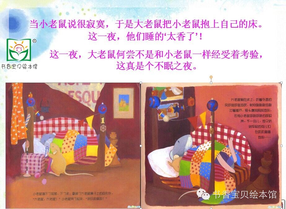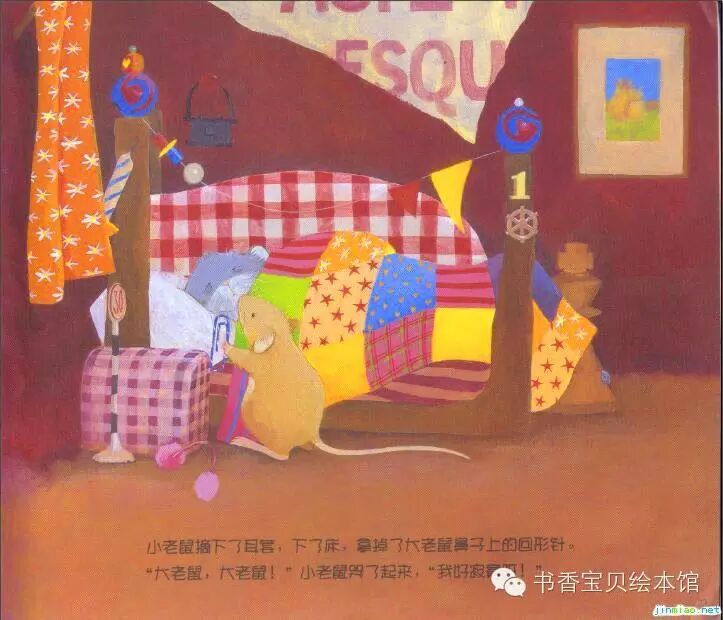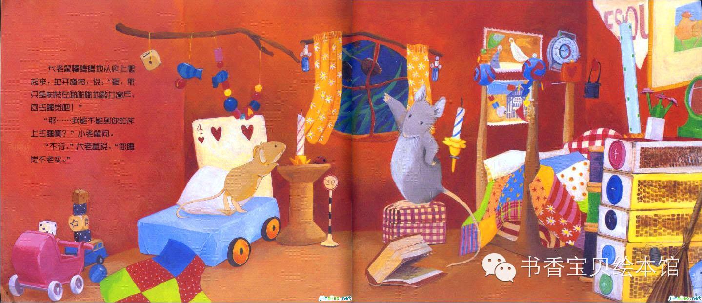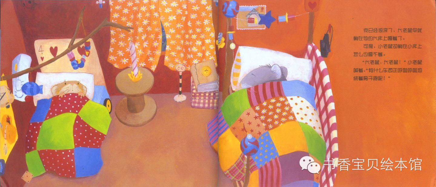 “不行,你还是睡自己的床更舒服。”大老鼠说着,就把小老鼠抱到了床上。