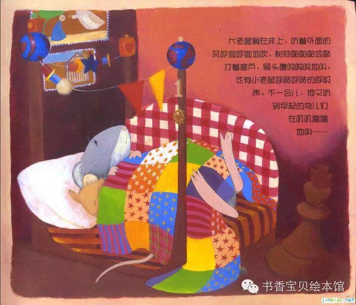 大老鼠躺在床上,听着外面的风呼啦呼啦地吹,树枝啪啪啪啪地敲打着窗户,猫头鹰呜呜呜地叫,还有小老鼠呼噜呼噜的呼吸声。不一会儿,他又听到早起的鸟儿们在叽叽喳喳地叫……