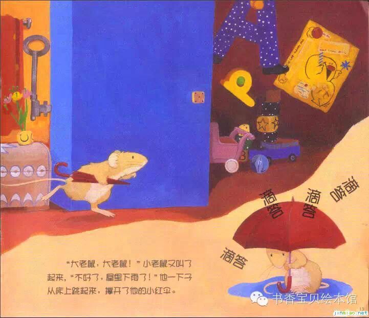 “大老鼠,大老鼠!”小老鼠又叫了起来,“不好了,屋里下雨了!”他一下子从床上跳起来,撑开了他的小红伞。