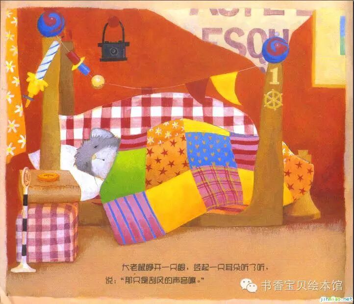 大老鼠睁开一只眼,竖起一只耳朵听了听,说:“那只是刮风的声音啊。”