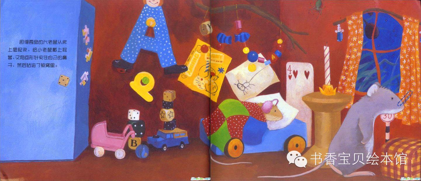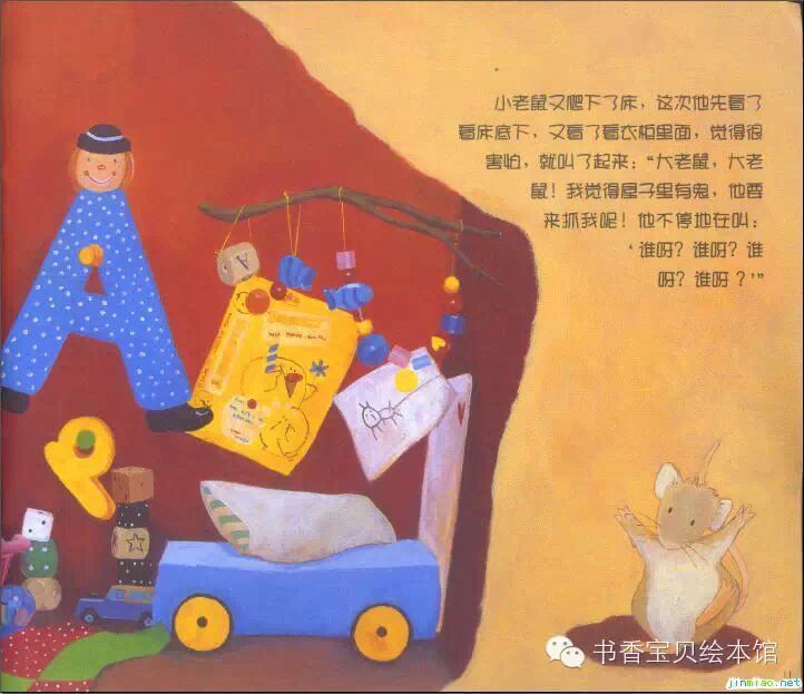 小老鼠又爬下了床,这次他先看了看床底下,又看了看衣柜里面,觉得很害怕,就交了起来:“大老鼠,大老鼠!我觉得屋子里有鬼,他要来抓我呢!他不停地在叫:‘谁呀?谁呀?谁呀?谁呀?”