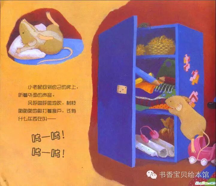 小老鼠躺在床上,听着碗面的风呼啦呼啦地吹,树枝啪啪啪地敲打着窗户,猫头鹰呜呜呜地叫。