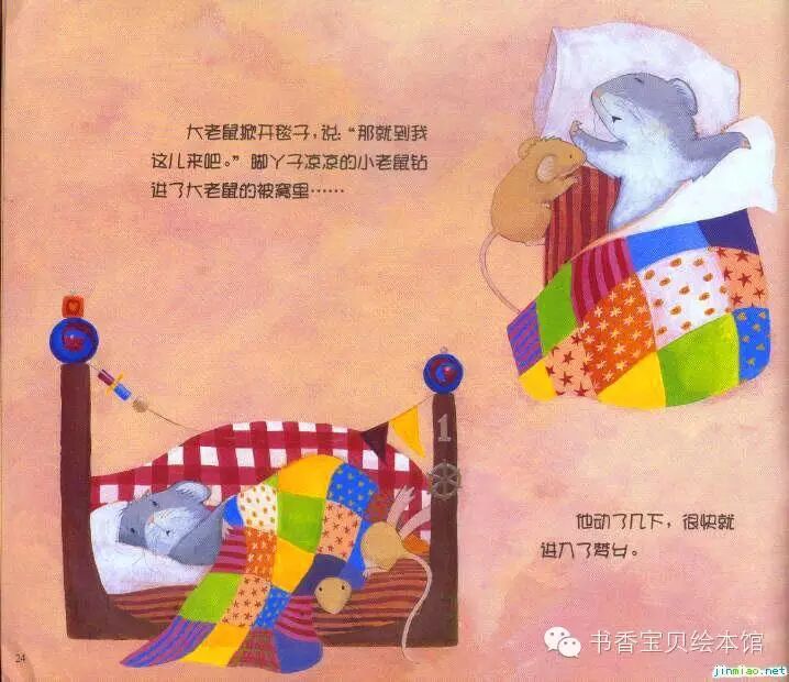 大老鼠掀开毯子,说:“那就到我这儿来吧。”脚丫子凉凉的小老鼠钻进了大老鼠的被窝里……