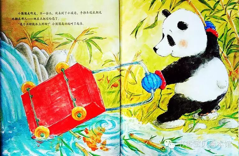 然后,两个小家伙把手推车翻了个底朝上,放在竹筏上,大团团勇士就撑着筏子绕过水里的石头。