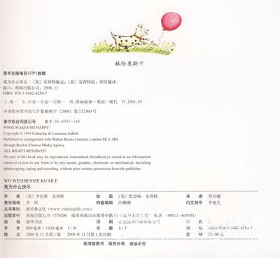 《我为什么快乐》用简单可爱的韵文和明亮柔和的水彩画,透过孩子们自己的眼睛,呈现出他们的种种东同情绪。