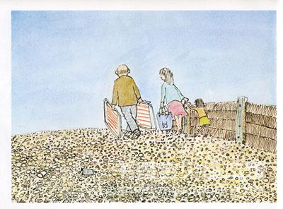 在《莎莉,离水远一点》里,伯宁罕明显是站在孩子的立场,生动地表达出他们脑中所想的以及心中所渴望的奇妙世界。故事叙述莎莉一家人带着大包小包来到海边。爸爸妈妈忙着放置椅子,摆放食物,莎莉则静静的一个人远望海面,瘦小的背影看起来孤单寂寞。整本书分成两条线进行,左页和右页的情节各自分开发展。书的左页全是妈妈的叮咛,而且大都是否定句。诸如不要去游泳、不要让新鞋沾到脏东西,还有扔石头不要打到人等等。然而除去言语之外,父母从未走近莎莉身边,和她一起玩耍。莎莉似乎觉得很无聊,她想摆脱一切规则的束缚。由此,右页就呈现出了莎莉的想象世界—— 一个刺激的冒险之旅。在这里,莎莉得以表现其英勇、机智的一面,更让她可以自得其乐,痛痛快快地玩一场。最后,莎莉要跟着父母一起回家了。可是,只有小读者知道,莎莉不像爸爸妈妈一样无聊地坐在沙滩上虚度时光,而是经历了一场惊心动魄的奇幻之旅。这正是许许多多的孩子所向往的。伯宁罕通过这本书,让大家都彷佛亲身经历了这一旅程。