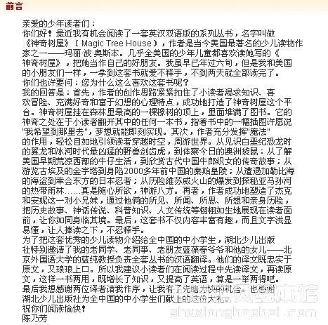 “神奇树屋”系列描述一对小兄妹杰克与安妮的冒险故事。八岁半的哥哥杰克理性冷静,喜欢看书,他会将沿途看到的事物记录在笔记本上;而七岁的妹妹安妮,喜爱幻想与冒险,并且勇于尝试。这两个一动一静、个性截然不同的兄妹,在森林里发现了一个堆满书的神奇树屋,神奇树屋就像时光机器,带他们到一个个不同的时空中旅行。于是,兄妹俩来到史前时代的恐龙谷。和骑士探访中古世纪的城堡,到古埃及破解木乃伊的秘密,跟着海盗出海寻宝……每一次的冒险都紧张刺激、精彩得不得了,更能让你在趣味中掌握不少知识呢!书中配有原汁原味的英文,能让小读者在步入高年级以后进行英文阅读!