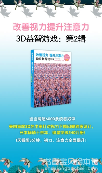 现在,丰富好看的第2辑又来了!第2辑精选了美国和日本首席3D艺术家的3D美图,精妙的设计让孩子在享受视觉盛宴的同时充分缓解眼周肌肉紧张、放松眼睛,快速恢复视力。色彩缤纷的3D图画细节丰富,反复观看同一幅画面,更可以培养细致的观察能力、提升注意力。
