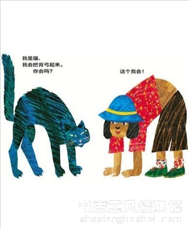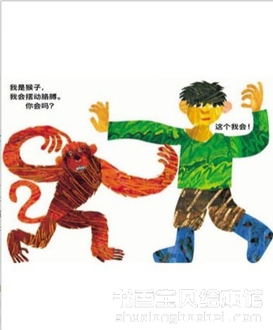 在《信谊•宝宝起步走:从头动到脚》中里,作者用独特的拼贴画,画出了大象会跺脚、大猩猩会捶胸、野牛会耸肩膀等十二种不同动物的“招牌动作”,并以“我会……,你会吗?”和“这个我会”的重复句型,邀请小小孩一起来转头、弯脖子、摆动胳臂,让孩子在玩乐中掌握一些重要的技能,比如认真倾听、集中注意力、听从指挥。通过《信谊•宝宝起步走:从头动到脚》,孩子们也学习到了各种身体部位及动作的说法,培养想象、发现与思考的能力。更重要的是,通过一次次地大声重复“你会吗?”“这个我会!”孩子能够建立起基本的自信心。而从这些简单的身体动作出发,孩子们得以在自信、愉悦的状态下,开始学习舞蹈、体操以及其他更复杂的运动技能。
