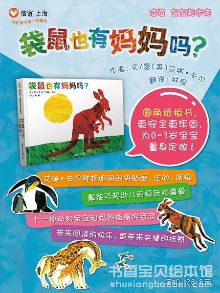 《信谊•宝宝起步走:袋鼠也有妈妈吗?》编辑推荐:艾瑞•卡尔鲜艳明丽的拼贴画,展示了11种动物宝宝和妈妈相互依偎的姿态,带来阅读的快乐,更带来亲情的抚慰。圆角纸板书,更安全更牢固,为0-3岁宝宝量身定做
