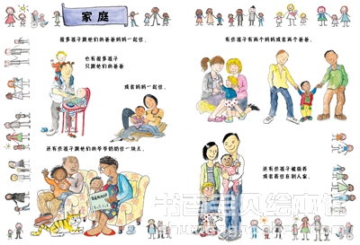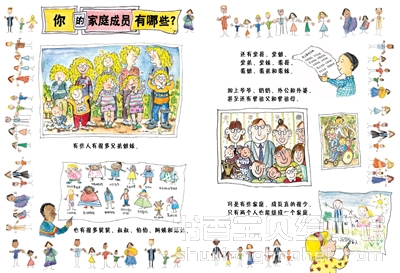 书中水彩画和跨页的形式,带着我们从住所、假期、学校、宠物,到家人的感觉和族谱……让孩子在轻松、无负担的阅读中,认识不同的家庭,认识这个多元的社会。此外,画家还在跨页的四周画上一大圈丰富的细节补充,采用的是儿童早期画的基本形态——“蝌蚪人”,十分活泼,涵盖了比如上学的文具、食物品种、旅游的必需品、宠物种类等等,吸引小读者仔细阅读和讨论,同时也能扩大知识面。