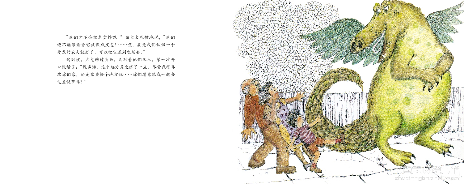 绘者海伦?奥克森伯里用自己的画笔讲述了这段天马行空的故事,也唤醒了我们心中沉睡的“宠物龙”。作品饱满的构图、活泼的用色、精细的刻??,每一幅画面都笼上了浪漫的气氛。特别是对人物神情的刻画,展现出了丰富的内心活动:白先生买回小龙时的得意眼神、奥兰多睁大眼睛望着小猫的惊讶目光……都让我们感到他们细腻微妙的情感变化,而大龙的每一个神态、每一个动作也让它活跃在我们的眼前。配合神奇岛朦胧的意境,绘者把更多的想象空间留给了看书的家长和孩子们。值得品味的是,作品不仅以构思精巧引人入胜,而且玛格丽特?梅喜的语言也极其优美:“翠绿夹杂着金黄色的森林”、“星光闪烁的城堡”、“海岸黑色的礁石中,浪花飞溅”……这些动人的词语像悦耳的音符构成优美旋律,给人美的享受,让人浮想联翩,回味无穷。