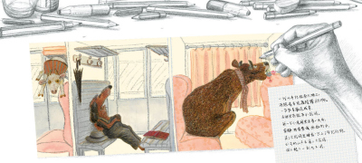 《火车上的乔安娜》非常特别,文/图作者卡琳•谢尔勒将话语权交给了画笔下的主人公——一只粉嫩粉嫩的小猪。我们能时刻感受到小猪和画家的对话。这样的实验主义图画书创作方法,打破了画家是造物主这样的常规,而是让主人公参与到自身的构建上来,变被动为主动。“怎么样啊,我的画家?你创造的角色比你还要聪明!”我们看到了这样一个有思想有主见的小猪乔安娜。   此外,本书的设计有其独到之处:同一时间下的多层空间。《莱茵邮报》评论道:“这位瑞士的艺术家通过这本充满智慧的图画书在现实与虚构之间轻松跳跃。”从画面来说,黑色素描的现实世界与色粉笔营造的梦幻世界为读者带来了一种陌生化的视觉体验。从文字的处理上来说,格纸上的文字与图画中的文字形成一种默契的对话方式。“这样好吗?乔纳森”画家对小猪用的是一种商量的口吻呢。从设计角度,先后出现的短书页又自然凸显出小猪的自我构建过程以及令人胆寒的妖魔穿越。   了德国式幽默及思辨精神,也能让读者感受到创作者们每一个创作过程背后的艰辛。列夫•托尔斯泰说:“人物一经作家塑造出来,他便开始了独立自主的生活,不再受作者的意志支配了。作者只能根据人物的性格行事。这就是为什么我的卡秋莎和普希金的塔季斯娅娜只能根据自己的而不是作者的意愿行事的原因。”这是列夫•托尔斯泰在写作中得出的经验,同样适用于本书。