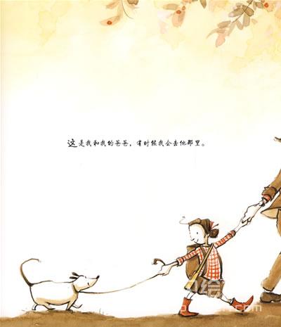 与文字的叙述风格一样,图画也是举重若轻。水彩浓淡适宜,轻盈明快,画面简单,用色单纯,点点片片的红色在褐与黄的色调渐变中“跳动”,如同卸下负荷后的心境;人、狗、物的描绘,诙谐有趣,悬荡在树上的淘气的脚、用桌布蒙住脑袋耍杂技的狗、摇曳在狗尾巴上的红袜子……一个个绝妙而滑稽的细节,让人忍俊不禁,笑过之后慢慢放下感伤和担忧。