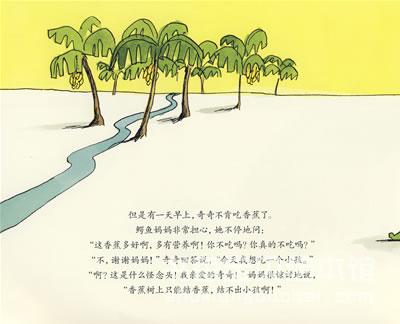 每天早上,妈妈都给小鱿鱼奇奇拿来好吃的香蕉当早餐,但是有一天早上,奇奇不肯吃香蕉了。鳄鱼妈妈非常担心,她不停地问:“这香蕉多好啊,多有营养啊!你不吃吗?你真的不吃吗?”“不,谢谢妈妈,”奇奇回答说,“今天我想吃一个小孩。”