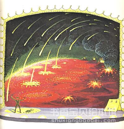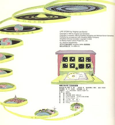 与上面两个作品相比,不论在题材、立意还是总体风格上,《生命的故事》(Life Story)都可以说是伯顿为数不多的独立创作的图画书作品中十分特殊的一部。这部颇具史诗气魄的作品别出心裁地将地球迄今为止的地理与生命演化历史浓缩在一个五幕剧里,并以极为浅近而又大气的语言,以及宏阔华丽又充满迷人的细节的画面,呈现了这一出对我们来说显得既遥远又切近的时空图景。