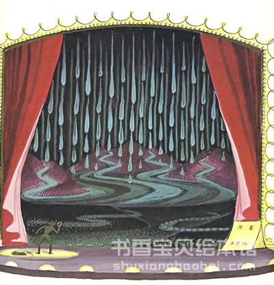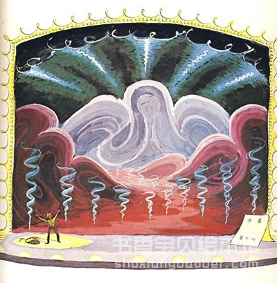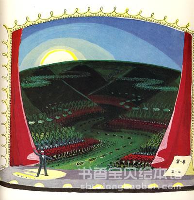 幕起时,从猩红的垂帘后徐徐向我们展露出来的幽邃的太空中,盘旋着缀满星光的蓝色星云;红、黑、蓝三色之间构成了一种令人屏息的强烈对比,在这样鲜明而又沉着的对比中,静默的画面仿佛充满了宇宙运行的宏大声响。尽管从翻页的逻辑看,这幅右页面上的插画出现在文字之后,但它显然比左页面上的文字说明更早地攫住了我们的注意力,并促使我们在一种近于迫不及待的情绪中,回到左页面上去溯寻关于它的叙说——“很多很多亿年前,我们的太阳诞生了,它是我们银河系中的上千亿颗恒星之一。”在时间上显得格外遥远的“很多很多亿年前”和在空间上显得格外广袤的“上千亿颗”,把读者带进到一片远古的时空中;但置放在“太阳”和“银河系”前的那两个亲切的“我们”,又使这片时空变得与我们的生命存在息息相关。伯顿十分巧妙地运用这种语言上的微妙技巧,创设出一种独特的叙述气势与情感氛围。而当我们把目光重新转向右面的这幅插图时,也会发现,通过那支呈对角线划过水平画面、指向太阳的光束,上述技巧同时在画里得到了呼应。从舞台出发射入太空的光束将幕前与幕后的世界联接在了一起,也将作为读者的我们与故事里的遥远时空联接在了一起;光束的斜线打破了环状星云所包含着的那份恒久的宁谧,暗示着叙述者的参与和历史叙说的开始。通过文字与画面的配合设计,作者在不知不觉地把我们推回那悠长绵远的时空隧道。
