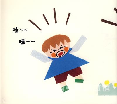 是的,答对了!小男孩的脸、衣服、小花、草地,甚至是天空中的云朵,都是用纸剪出来贴在白纸上,然后再根据故事为主人公画上表情,填画出一个又一个亲切、可爱的图案。就是一个名副其实的剪贴绘本。