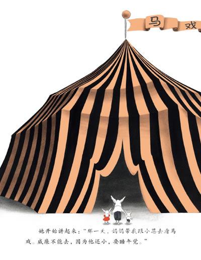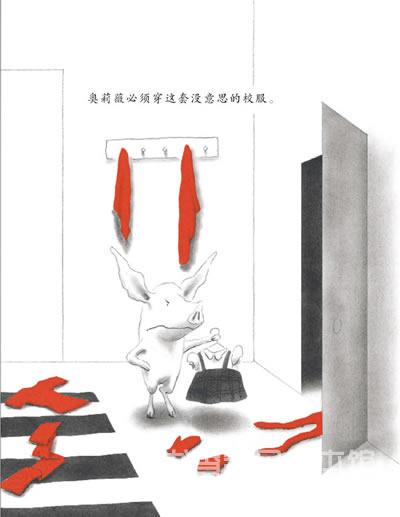 是的,面对观众,奥莉薇从来都容光焕发,但你要看到,给孩子一次讲述的机会,让教室变成舞台,那可是成人仁慈的创造。孩子随即的创造便不再拘泥于黑底子上的点点缀缀,而是哗地一下抖出一顶鲑鱼红的大帐篷,顶上旗帜般飘扬的“马戏团”这个词和意象带着往昔的喧闹与昂扬,让故事一下子恣意、磅礴起来。要让自己在故事里绽放,就得先让别人凋谢。嗯,让他们都得中耳炎去好了。然后是古希腊戏剧中的“机械降神”法——天降英雄,以此达成简单而圆满的叙事,却丝毫不显露此种模式的僵硬与尴尬,因为降落的是一头小猪,故事怎能不俏皮起来?